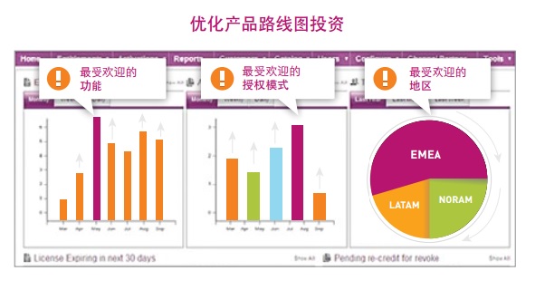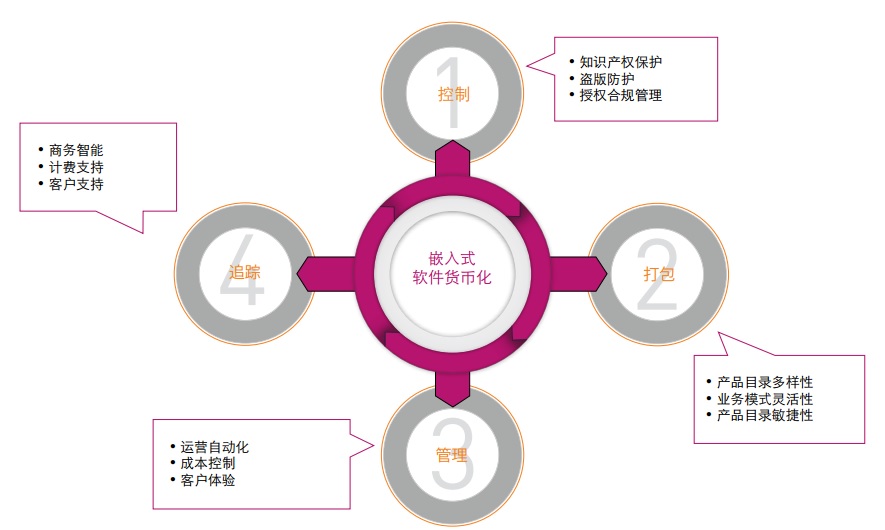 控制產品的使用:使用控制是貨幣化的下一個難關。供應商必須能夠在產品和功能層面控制設備,以防止產品被過度使用,并達到更大的產品打包靈活性。這可以通過功能型授權來完成,讓設備供應商得以最大限度地減少所管理的硬件庫存數量,并且減少加工、制造和運營成本。