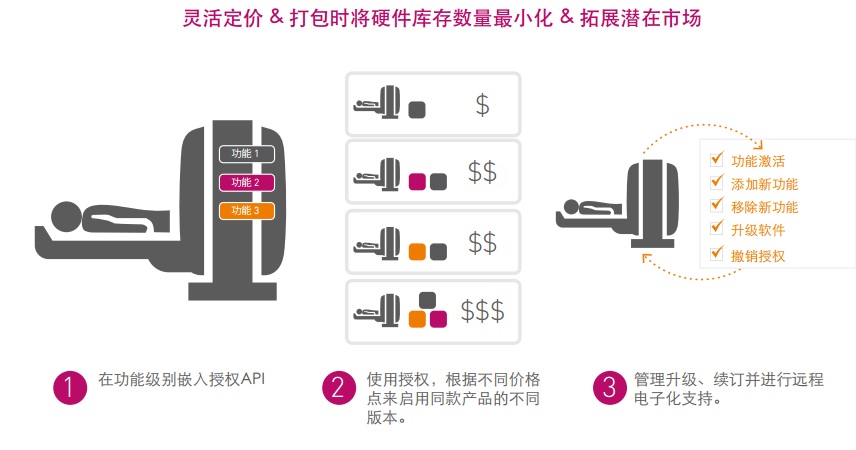 當您將功能級授權以及打包能力搭建到硬件產品目錄中時,即可真正提升單個硬件設備在大量多樣化市場中的總體可用性。停用或移除“基本”版本設備的高級功能意味著能以更低的價格提供該設備,從而贏得低端市場。或者,設備供應商也可以對一些為高端客戶或縫隙市場提供附加價值的高級功能收取額外費用。有一點是確定無疑的,醫療設備供應商若不具備將硬件及解決方案各項功能貨幣化的能力,其市場適用性或產品定價會受到極大限制,這也等同于喪失了收入機會。