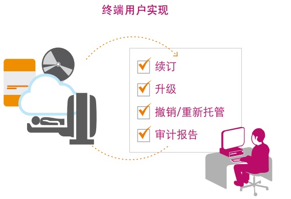 客戶實現指的是讓終端客戶可以做很多當前讓銷售、客戶服務、技術支持和領域服務團隊停滯不前的任務。這些任務包括但不限于授權依從性報告、設備激活、續訂、升級、取消等等。