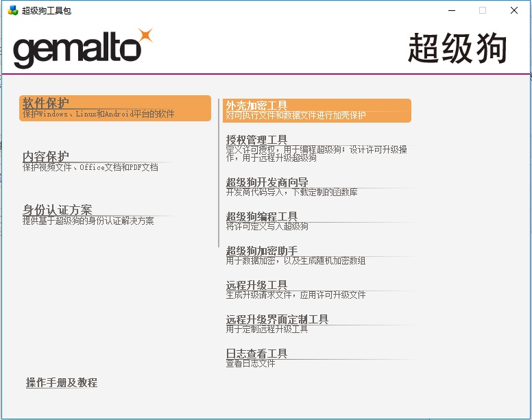賽孚耐(金雅拓)超級狗是一款功能強大,加密強度高,操作簡單的加密狗,尤其是外殼加密工具,它除了能對普通windows程序加密外,還可以加密安卓程序,通過數據加密方式加密視頻、文檔、Flash等多媒體文件,以及AppOnChip方式實現程序代碼在加密狗中運行。