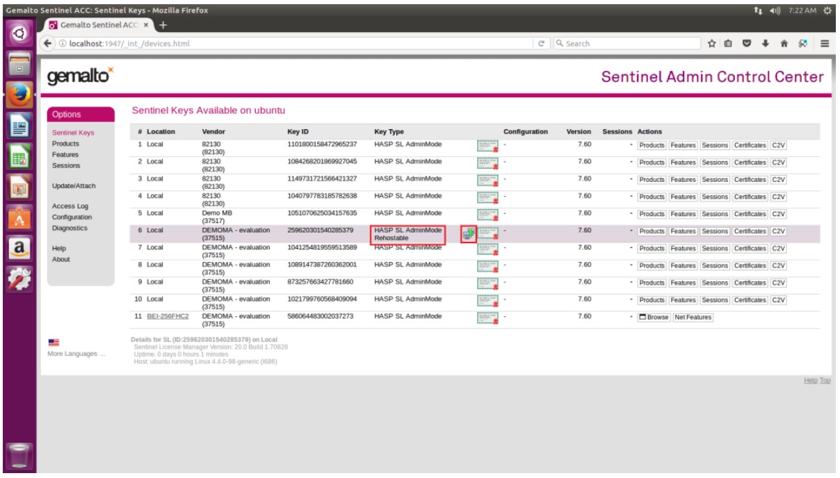 SL能夠實現 Rehost 的前提條件是 SL本身是可遷移的,也就是 Rehostable 的。可以進入 A 電腦上打開 ACC(瀏覽器打開 http://localhost:1947,點擊 Sentinel Keys 查看 SL的狀態),如下邊截圖所示紅色框對應的這個 SL就是 Rehostable的,可以遷移,其它SL都不可遷移。如果想遷移其它 SL,就必須將 SL升級為具備 Rehostable 屬性。 具體請看下邊的步驟二。