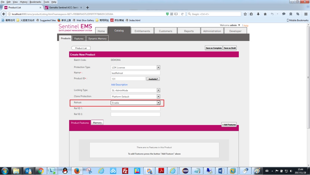 (c、 )去 EMS 里邊Entitlement 標簽頁下,像正常升級加密鎖一樣的標準步驟進行操作。新建 Entitlement,然后Entitlement type選擇中間的Product Key,添加上剛才定義的產品testRehost,然后點擊 Produce,接著 Activate。