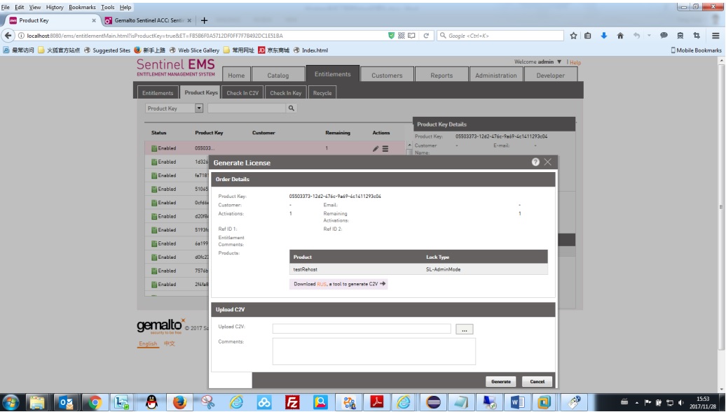 在Generate License窗口中,Upload C2V選擇之前A電腦上需要升級的SL產生的testRehost.c2v文件。然后點擊 Generate產生對應的v2c 升級文件。