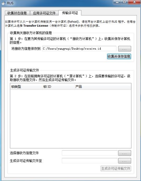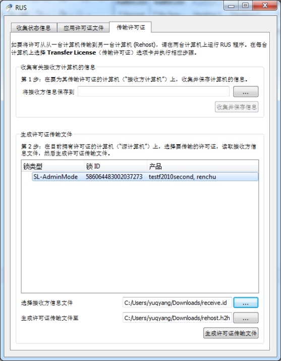 在 A 電腦上,同樣運行RUS,選擇需要Rehost遷移的SL,“選擇接收方信息文件” 選擇 B 電腦上生成的receive.id;“生成許可證傳輸文件至” 選擇一個自定義的名字,比如為 rehost.h2h。點擊右下角的按鈕“生成許可證傳輸文件”即可生成rehost.h2h。將這個 rehost.h2h文件發給B電腦。