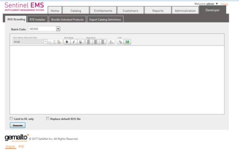 去開發電腦上打開 EMS,進入 Developer 標簽頁,可以看到RUS Branding標簽頁, BatchCode選擇你的正式號(比如截圖中的 KEOKE),插上主鎖,點擊左下角的 Generate,就可以產生正式號對應的 RUS 遠程升級工具。