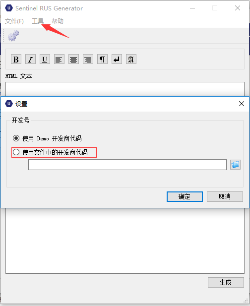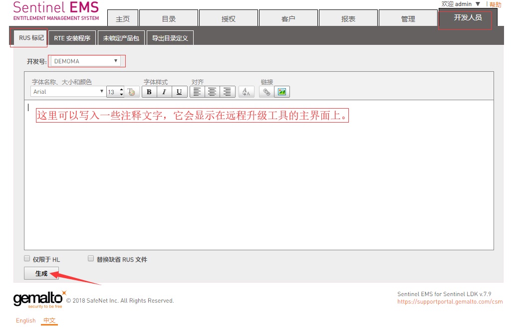 登錄EMS,在“開發人員”界面,選“RUS標記”,選擇自己的主鎖開發號,填入適當的注釋文字(也可以不填),左下角點生成,系統會生成一個“RUS”開頭的exe文件。