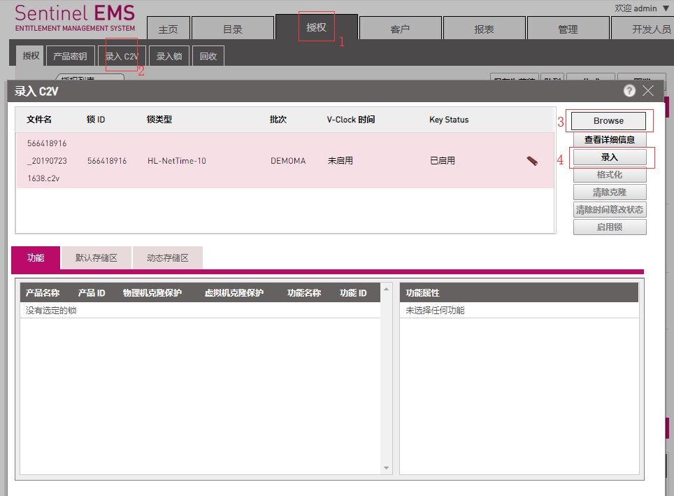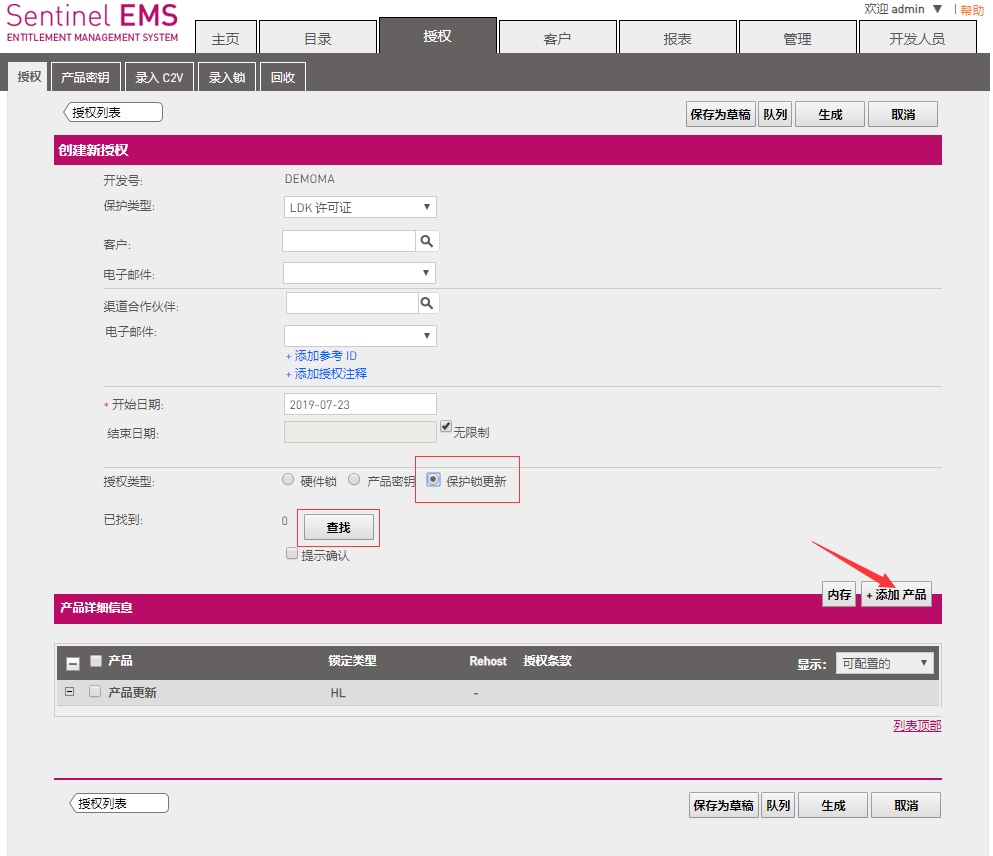 3、軟件開發商在收到此c2v文件后,將此文件錄入到EMS中,然后將需要更新或添加的內容按正常子鎖授權流程新建產品和新建訂單。