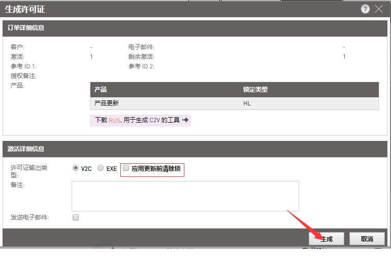 4、生成一個升級文件,可以選擇v2c或exe方式(v2c通過RUS工具升級,exe是直接運行升級,LDK9.0以后不再支持exe方式),如果升級時同時需要清除原加密鎖中的內容,請勾選“應用更新前清除鎖”。