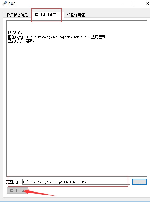 6、以RUS工具升級方式為例,在客戶端運行遠程升級工具,加載升級文件,點“應用更新”,顯示“已成功寫入更新”即表示更新成功。