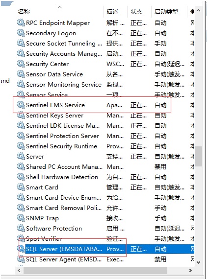 3、 重啟Sentinel EMS server和SQL Server(EMSDATABASE)服務。