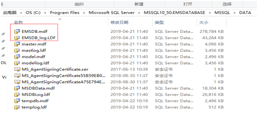 2、進入C:\Program Files\Microsoft SQL Server\MSSQL10_50.EMSDATABASE\MSSQL\DATA目錄,把這兩個文件復制備份。