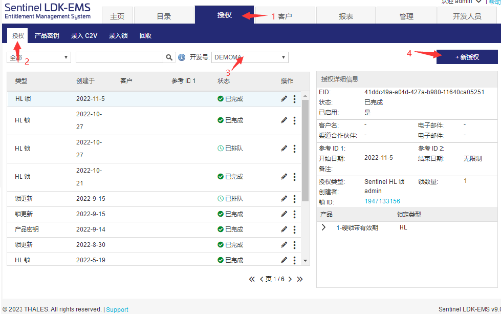 請按圖示步驟選擇1目錄,2授權,3開發號,4新授權,其中開發號是對應5個字母的主鎖開發號,測試用戶請選擇DEMOMA
